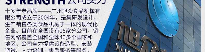 廣州旭眾食品機(jī)械有限公司是一家集科研開(kāi)發(fā),生產(chǎn)設(shè)計(jì),營(yíng)銷服務(wù)為一體的現(xiàn)代化生產(chǎn)企業(yè)?,F(xiàn)代化生產(chǎn)車間,精湛制造技術(shù),所產(chǎn)機(jī)械歷經(jīng)市場(chǎng)重重考驗(yàn),不斷贏得海內(nèi)外客戶的贊譽(yù)。