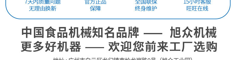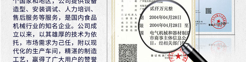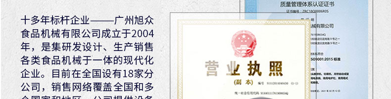 廣州旭眾食品機械有限公司是一家集科研開發(fā),生產(chǎn)設計,營銷服務為一體的現(xiàn)代化生產(chǎn)企業(yè)?,F(xiàn)代化生產(chǎn)車間,精湛制造技術,所產(chǎn)機械歷經(jīng)市場重重考驗,不斷贏得海內(nèi)外客戶的贊譽。