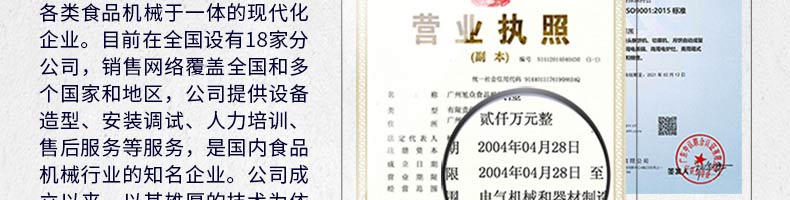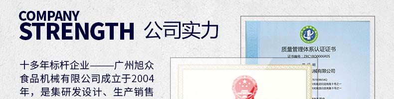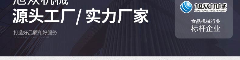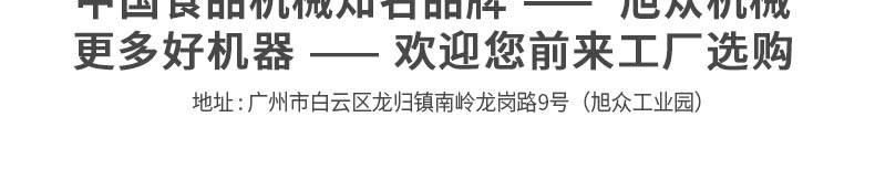 廣州旭眾食品機械有限公司是一家集科研開發(fā),生產設計,營銷服務為一體的現(xiàn)代化生產企業(yè)?,F(xiàn)代化生產車間,精湛制造技術,所產機械歷經市場重重考驗,不斷贏得海內外客戶的贊譽。