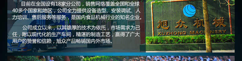 廣州旭眾食品機(jī)械有限公司是一家集科研開(kāi)發(fā),生產(chǎn)設(shè)計(jì),營(yíng)銷服務(wù)為一體的現(xiàn)代化生產(chǎn)企業(yè)。現(xiàn)代化生產(chǎn)車間,精湛制造技術(shù),所產(chǎn)機(jī)械歷經(jīng)市場(chǎng)重重考驗(yàn),不斷贏得海內(nèi)外客戶的贊譽(yù)。
